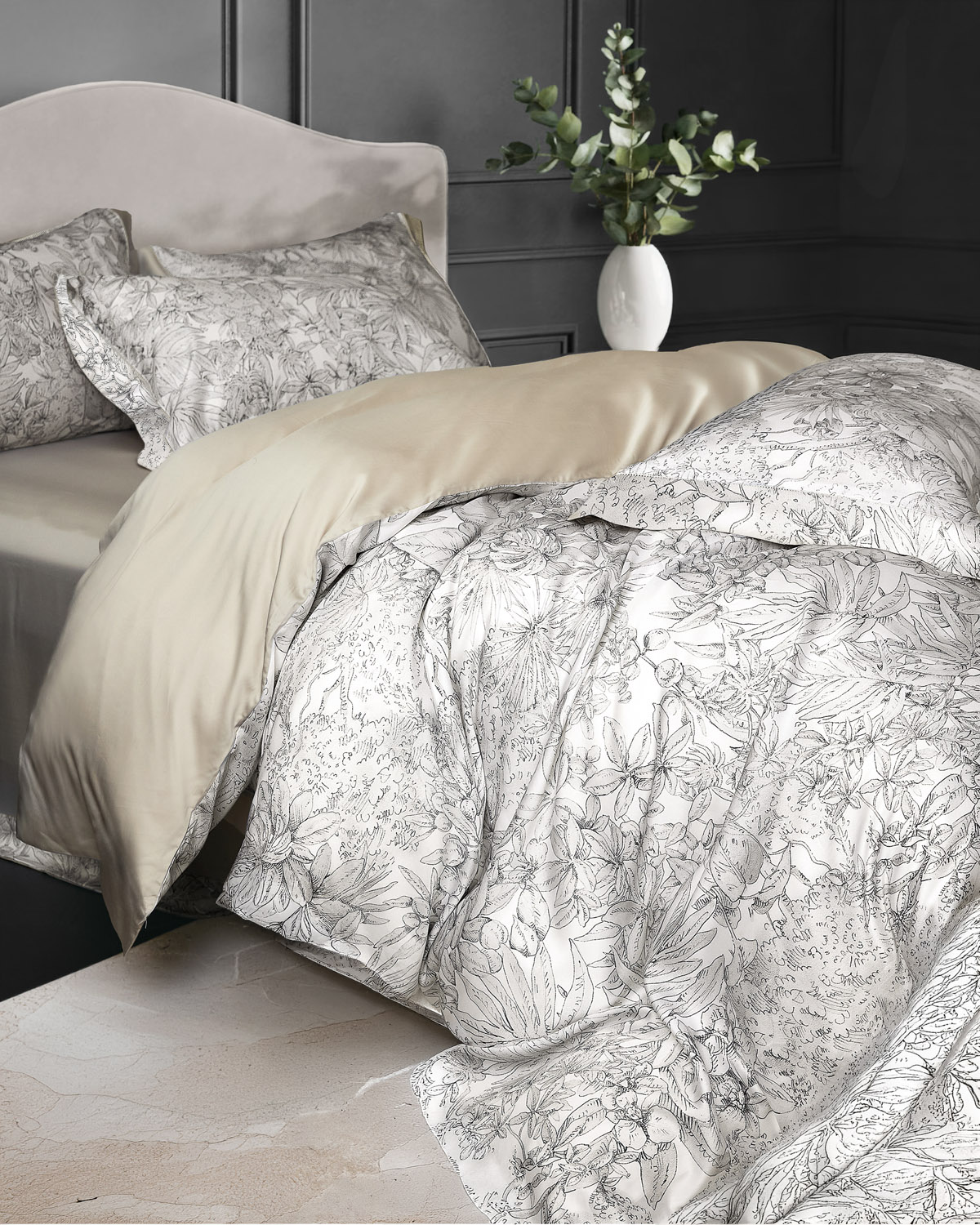 Ένα υπέρκομψο, υπέρδιπλο πάπλωμα, διπλής όψης σε γήινες αποχρώσεις. Η πάνω όψη είναι με διακριτικά λουλούδια σε ανοιχτόχρωμη βάση ενώ η πίσω όψη είναι σε μπεζ απόχρωση. Το εξωτερικό ύφασμα είναι κατασκευασμένο από 100% Tencel Lyocell, 300 κλωστών με νήματα πενιέ, που το καθιστά εξαιρετικά μαλακό, ανθεκτικό και εύκολο στο σιδέρωμα, ενώ η γέμιση του είναι από ψημένη, υποαλλεργική, πολυεστερική βάτα 380γρ/τμ. Η ποιότητα και το μοναδικό τους σχέδιο τους θα δώσουν στην κρεβατοκάμαρά σας ένα ξεχωριστό στυλ. Στο σετ περιλαμβάνονται και δύο μαξιλαροθήκες τύπου oxford διπλής όψης.