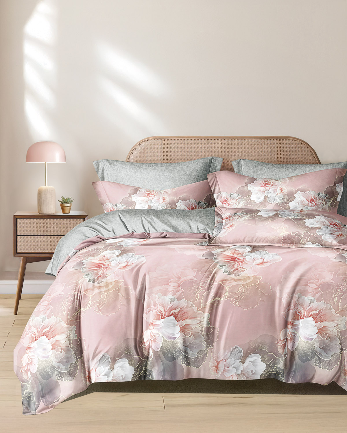 Ένα υπέρκομψο σετ κουβερλι διπλής όψης σε παστέλ αποχρώσεις που αποπνέει κομψότητα. Παστέλ ροζ με εντυπωσιακά λουλούδια η πάνω όψη και ανοιχτό γκρι η κάτω όψη σίγουρα θα δώσει φρεσκάδα στο χώρο σας. Το εξωτερικό ύφασμα είναι κατασκευασμένο από 100% βαμβακοσατέν, 200 κλωστών με νήματα πενιέ, που το καθιστά εξαιρετικά μαλακό, ανθεκτικό και εύκολο στο σιδέρωμα, ενώ η γέμιση του είναι από ψημένη, αντιαλλεργική, πολυεστερική βάτα 100γρ/τμ. Η ποιότητα και το μοναδικό τους σχέδιο τους θα δώσουν στην κρεβατοκάμαρά σας ένα ξεχωριστό στυλ. Στο σετ περιλαμβάνονται και δύο μαξιλαροθήκες τύπου oxford διπλής όψης.
