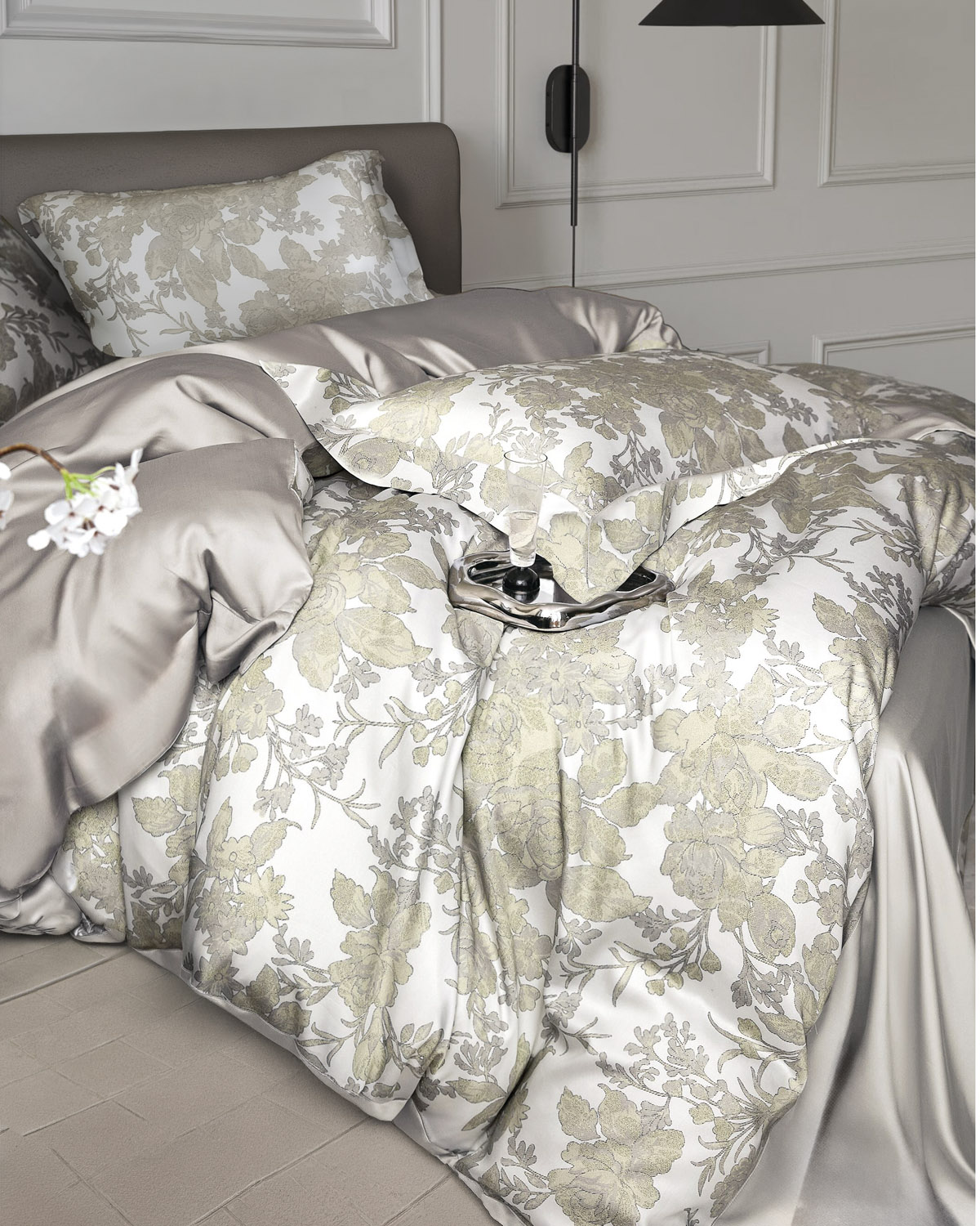 Ένα υπέρκομψο, υπέρδιπλο πάπλωμα, διπλής όψης σε γήινες αποχρώσεις. Η πάνω όψη είναι με διακριτικά λουλούδια σε πιο ανοιχτή βάση ενώ η πίσω όψη είναι μονόχρωμη. Το εξωτερικό ύφασμα είναι κατασκευασμένο από 100% Tencel Lyocell, 300 κλωστών με νήματα πενιέ, που το καθιστά εξαιρετικά μαλακό, ανθεκτικό και εύκολο στο σιδέρωμα, ενώ η γέμιση του είναι από ψημένη, υποαλλεργική, πολυεστερική βάτα 380γρ/τμ. Η ποιότητα και το μοναδικό τους σχέδιο τους θα δώσουν στην κρεβατοκάμαρά σας ένα ξεχωριστό στυλ. Στο σετ περιλαμβάνονται και δύο μαξιλαροθήκες τύπου oxford διπλής όψης.